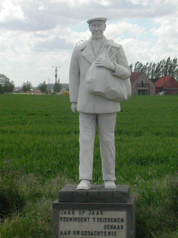 De afbeelding 'Beeld De seizoensarbeider' gemaakt door Missiaen, Halewijn wordt ter beschikking gesteld door Agentschap Onroerend Erfgoed (AOE) onder de volgende voorwaarden: Modellicentie voor gratis hergebruik, Naamsvermelding 4.0 Internationaal.