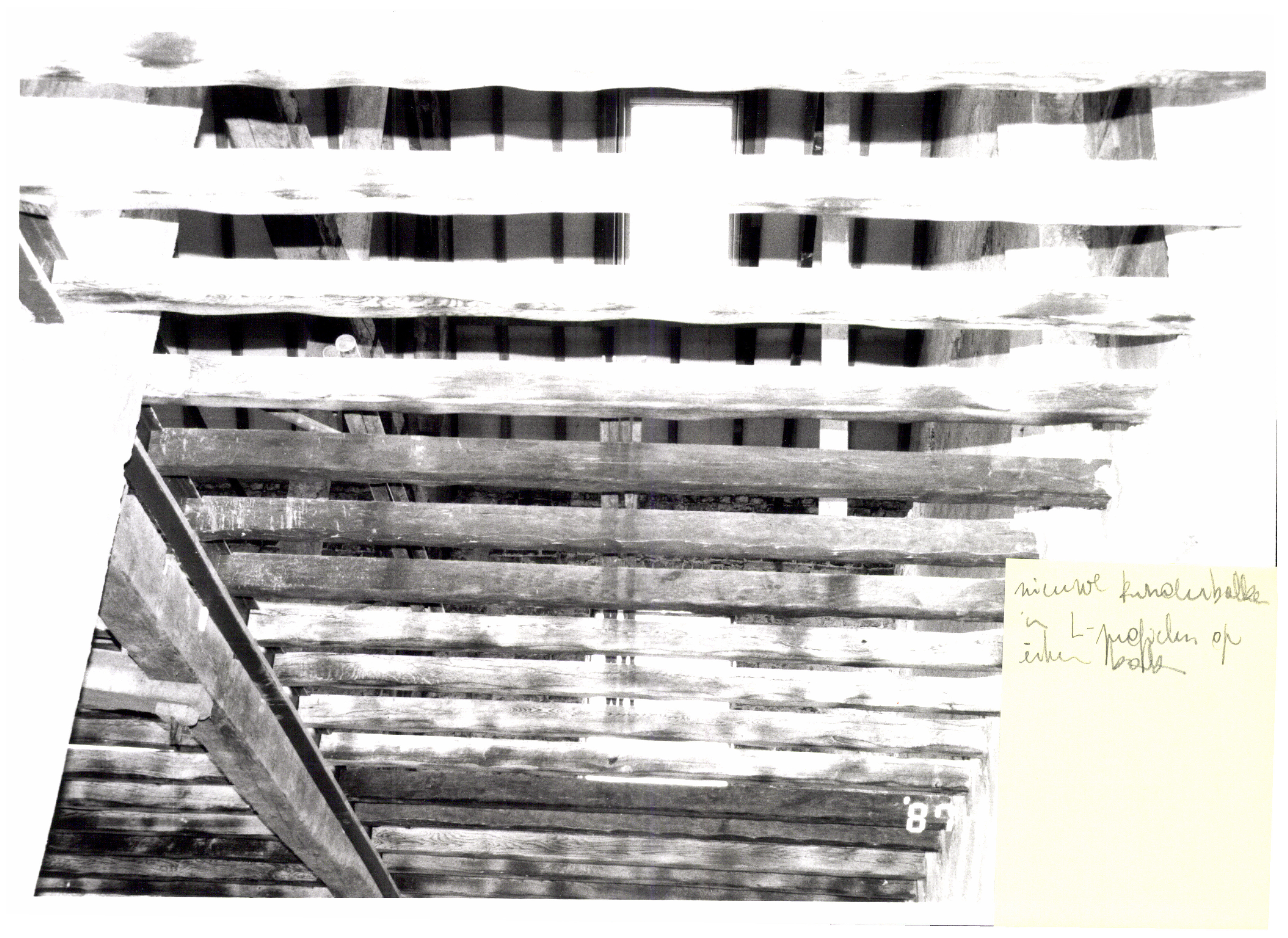 Overtreding 15/09/1987 - opschrift Post-it: "nieuwe kinderbalken/in L-profielen op/eiken balk"