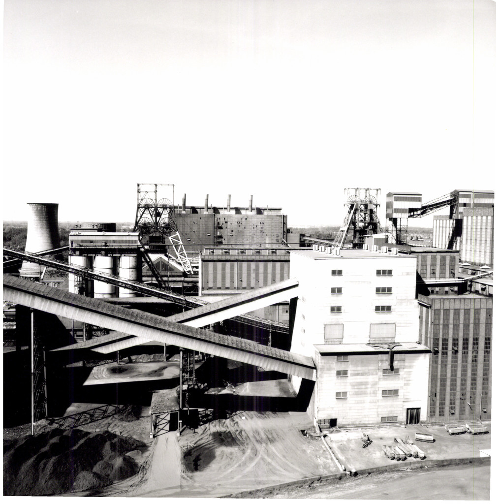 Zicht op de achterkant van de mijnzetel. Vooraan de transportbanden tussen brutkoolbunkers en kolenwasserij, schachtbokken en achteraan het ketelhuis (met schouwen op het dak) van de elektriciteitscentrale.