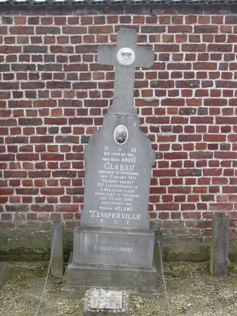 De afbeelding 'Poperinge: Stedelijke begraafplaats: Grafsteen Belgische militair Eerste Wereldoorlog Clabou' gemaakt door Decoodt, Hannelore wordt ter beschikking gesteld door Agentschap Onroerend Erfgoed (AOE) onder de volgende voorwaarden: Modellicentie voor gratis hergebruik, Naamsvermelding 4.0 Internationaal.
