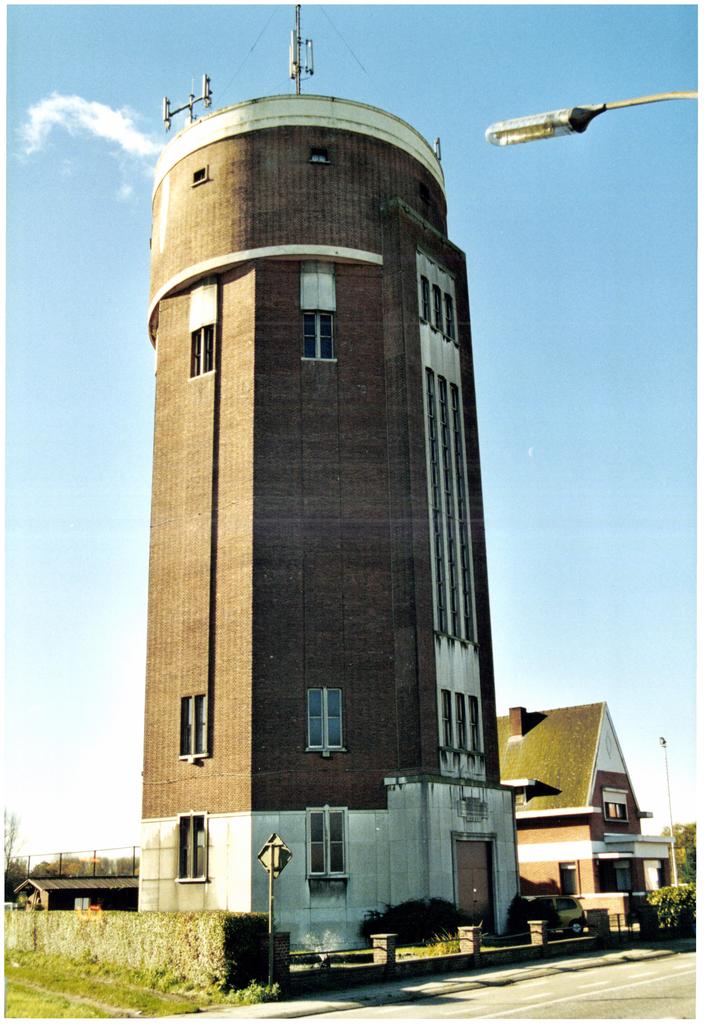 De afbeelding 'Watertoren met woonhuis' gemaakt door De Schepper, Jo wordt ter beschikking gesteld door Agentschap Onroerend Erfgoed (AOE) onder de volgende voorwaarden: Modellicentie voor gratis hergebruik, Naamsvermelding 4.0 Internationaal.