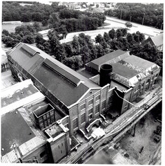 Bovenaanzicht vanop de hoge skipschachtbok (1962) op de beide extractiemachinegebouwen en de centrale persluchthal met links ervan de uitlaatschouw van de oude Rateau-ventilator (1917) en rechts de ronde uitlaat van de K.K.K. ventilator uit de jaren '50.