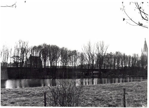 De afbeelding 'Zicht op vesting ten zuiden van Menenpoort' wordt ter beschikking gesteld door Agentschap Onroerend Erfgoed (AOE) onder de volgende voorwaarden: Modellicentie voor gratis hergebruik, Naamsvermelding 4.0 Internationaal.