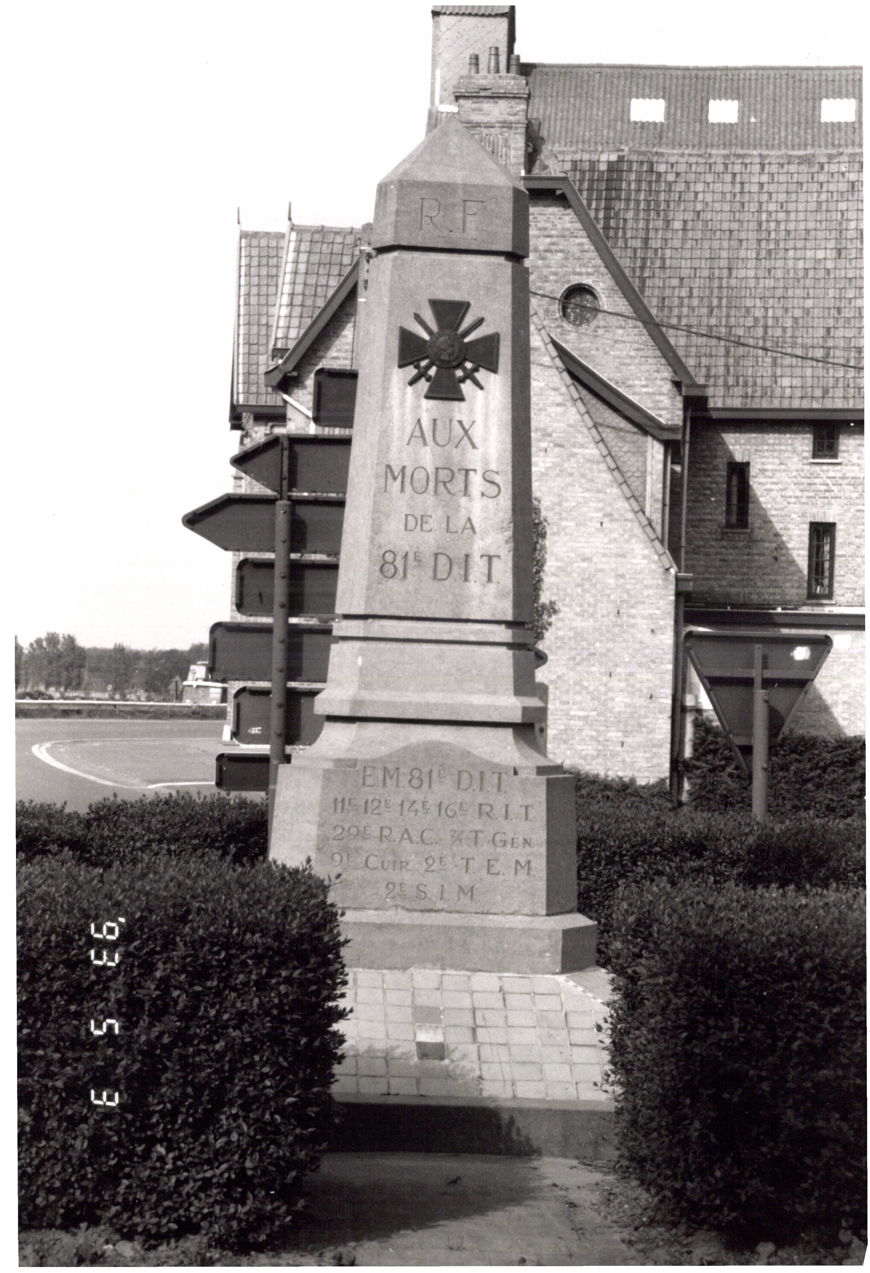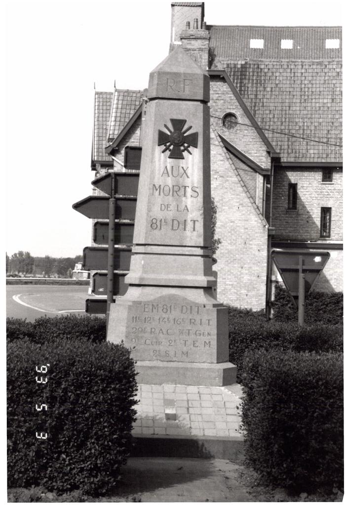 De afbeelding ' Gedenkzuil 81ste Franse infanteriedivisie' wordt ter beschikking gesteld door Agentschap Onroerend Erfgoed (AOE) onder de volgende voorwaarden: Modellicentie voor gratis hergebruik, Naamsvermelding 4.0 Internationaal.