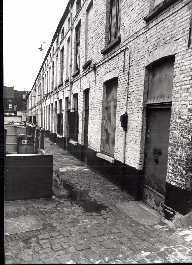 De afbeelding 'Huizen in eenzijdig bebouwd steegbeluik' wordt ter beschikking gesteld door Agentschap Onroerend Erfgoed (AOE) onder de volgende voorwaarden: Modellicentie voor gratis hergebruik, Naamsvermelding 4.0 Internationaal.