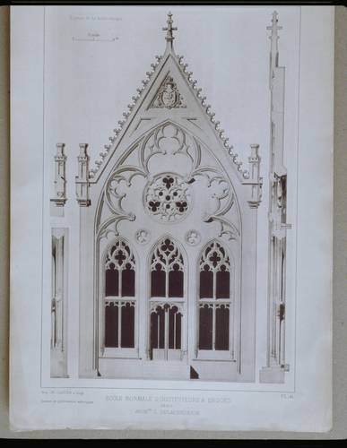 Alle rechten op de afbeelding 'De Rijksnormaalschool: n.o.v. de la Censerie - geveltop bibliotheek - aanzicht & doorsnede (uit l'Emulation)' gemaakt door Pauwels, Oswald zijn voorbehouden aan Pauwels, Oswald.