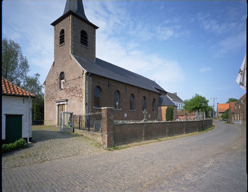 Alle rechten op de afbeelding 'Kasseiweg met kerk, kerkhofmuur en dorpshuizen: algemeen zicht' gemaakt door Pauwels, Oswald zijn voorbehouden aan Pauwels, Oswald.