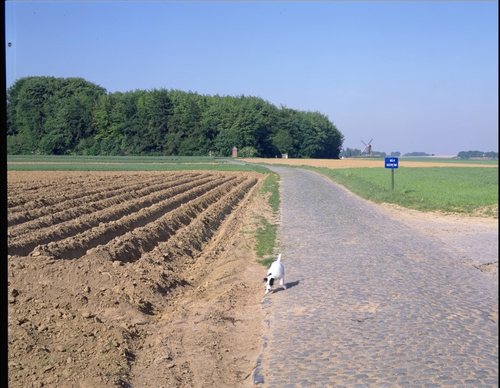 Alle rechten op de afbeelding 'Kasseiweg in landschap met bos en molen - alg.zicht' gemaakt door Pauwels, Oswald zijn voorbehouden aan Pauwels, Oswald.