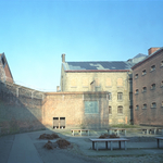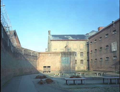 Het Pandreitje ; historisch gevangenisgebouw: exterieur ; binnenkoer met L - muur R: cellenblok - gesloopt 1992