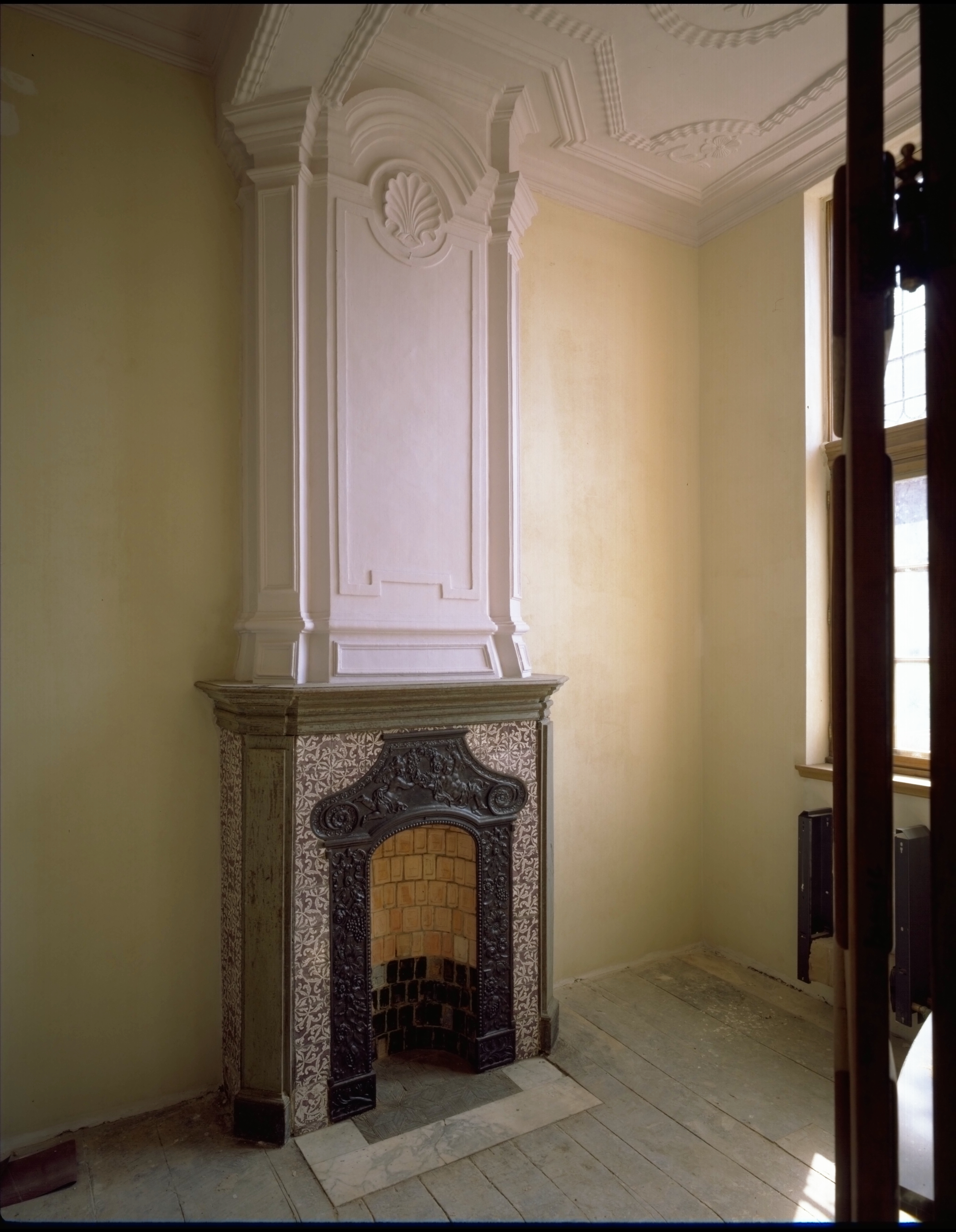 Publicatie(s): M&L 12/4 p. 38 Het huis "De Leliën": interieur ; schoorsteen en stucwerk - linkse achterkamer - eerste verdieping algemeen zicht (L.45°) na restauratie Label(s): woningen, interieurs, schouwen