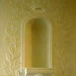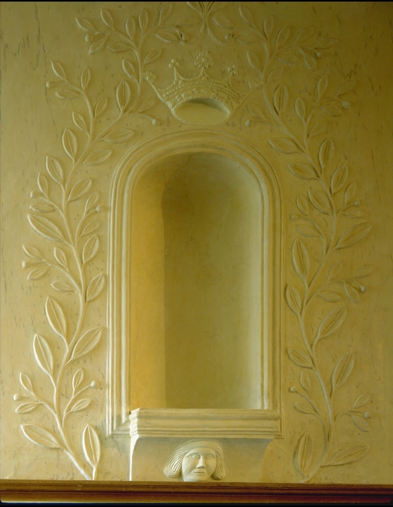 Het huis "De Leliën": interieur, gelijkvloers - gang - nis met rank en bladmotieven in stucwerk Label(s): woningen, interieurs