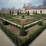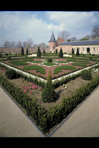 Publicatie(s): M&L 10/3, p. 37: de oranjerietuin van het zuidoosten. Rond het centraal motief ligt een witte schaduwrand. Zes taxus kegels vormen het verticaal element / M&L extra Label(s): landelijke gebouwen, tuinen