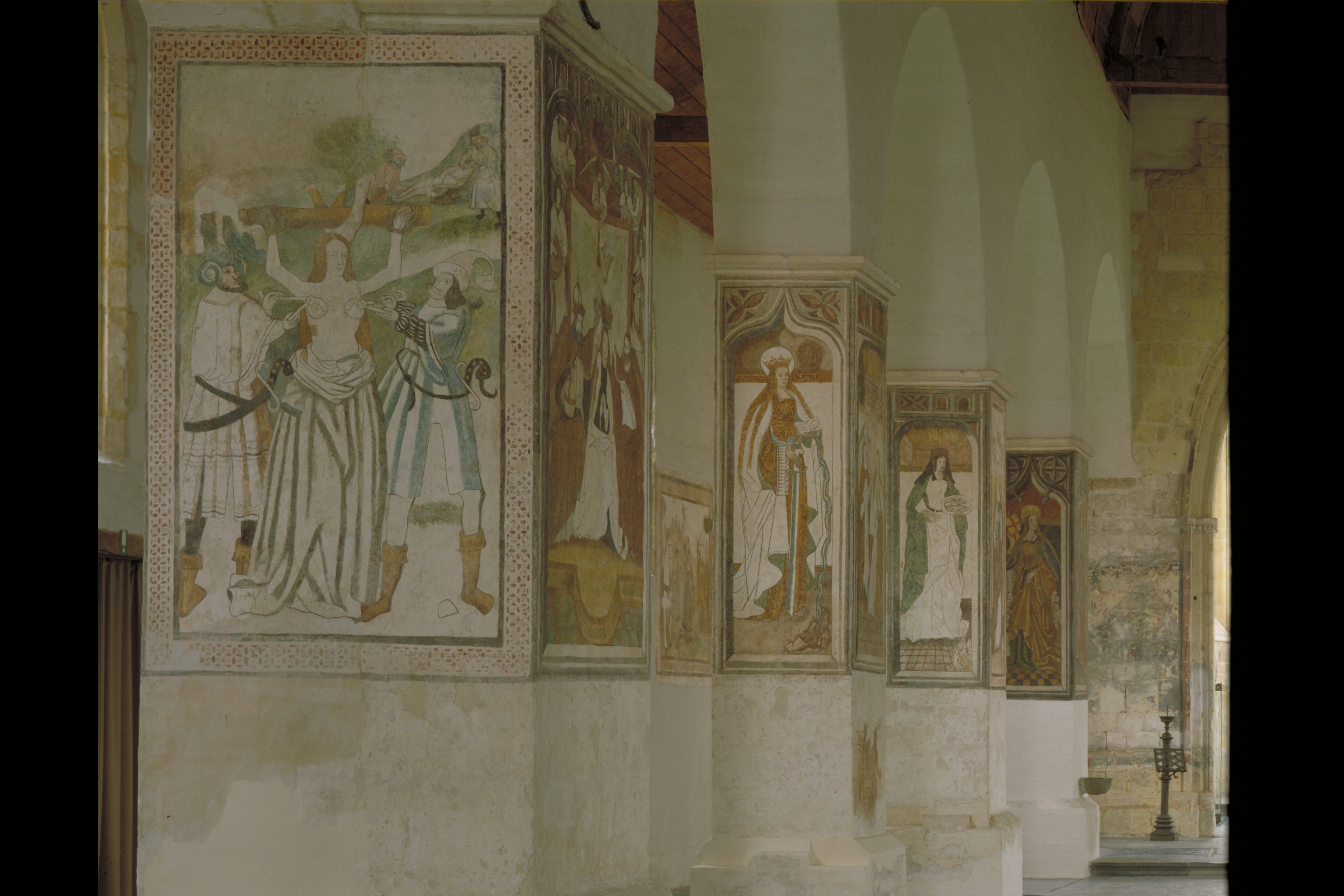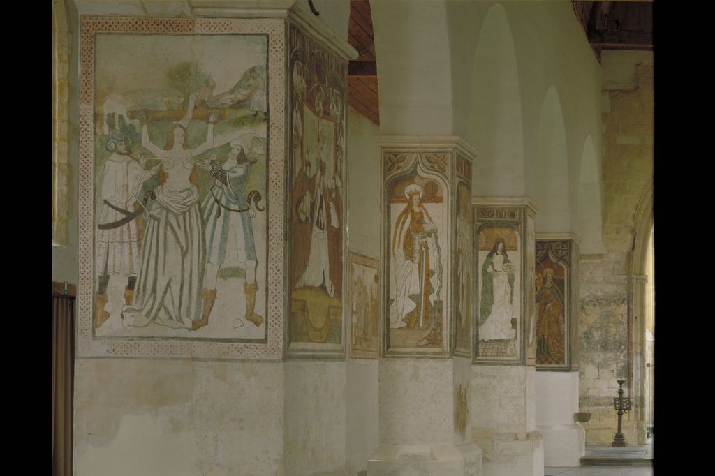 De Begijnhofkerk St.Agnes: interieur ; muurschildering - detail: pijler met St.Elisabeth van Hongarije en H.Genoveva van Parijs