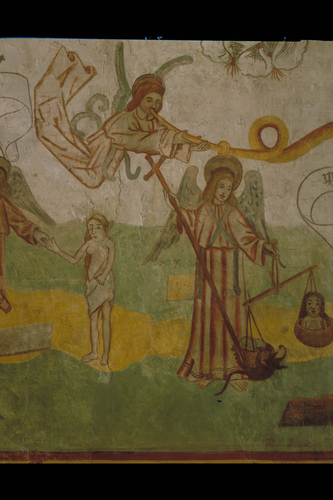 Alle rechten op de afbeelding 'De St.Genovevakerk: interieur ; muurschildering - detail: aartsengel Gabriël tijdens het wegen van de zielen' gemaakt door Pauwels, Oswald zijn voorbehouden aan Pauwels, Oswald.
