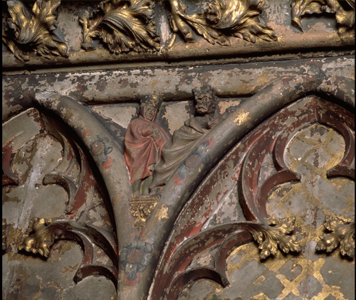 Parochiekerk Sint-Martinus: interieur, askapel, - detail: gepolychromeerde sculptuur rond blindnissen Label(s): kerken, interieurs, overig beeldhouwwerk