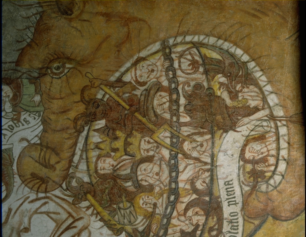 Alle rechten op de afbeelding 'De St.Genovevakerk: interieur ; muurschildering ; voorstelling toegang tot hel ; mond van monster - detail' gemaakt door Pauwels, Oswald zijn voorbehouden aan Pauwels, Oswald.