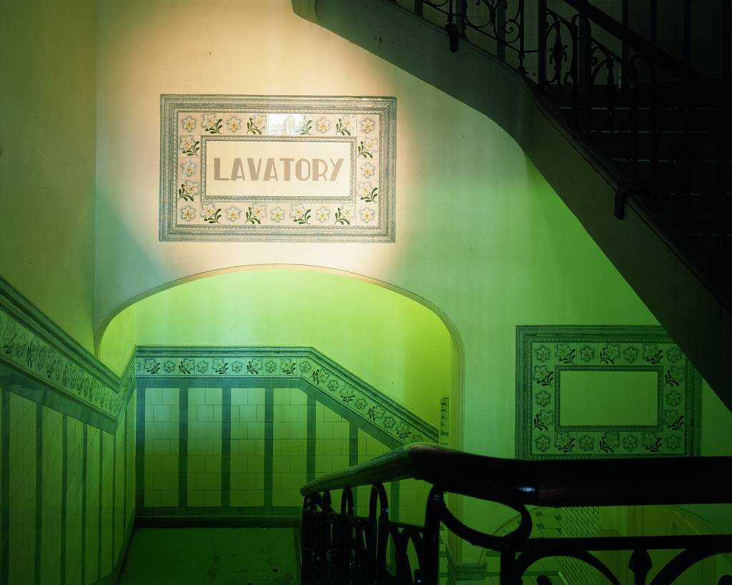 Alle rechten op de afbeelding 'Vooruit: feestlokaal trap naar toiletten met wandpaneel en lambrisering in wandtegels' gemaakt door Pauwels, Oswald zijn voorbehouden aan Pauwels, Oswald.