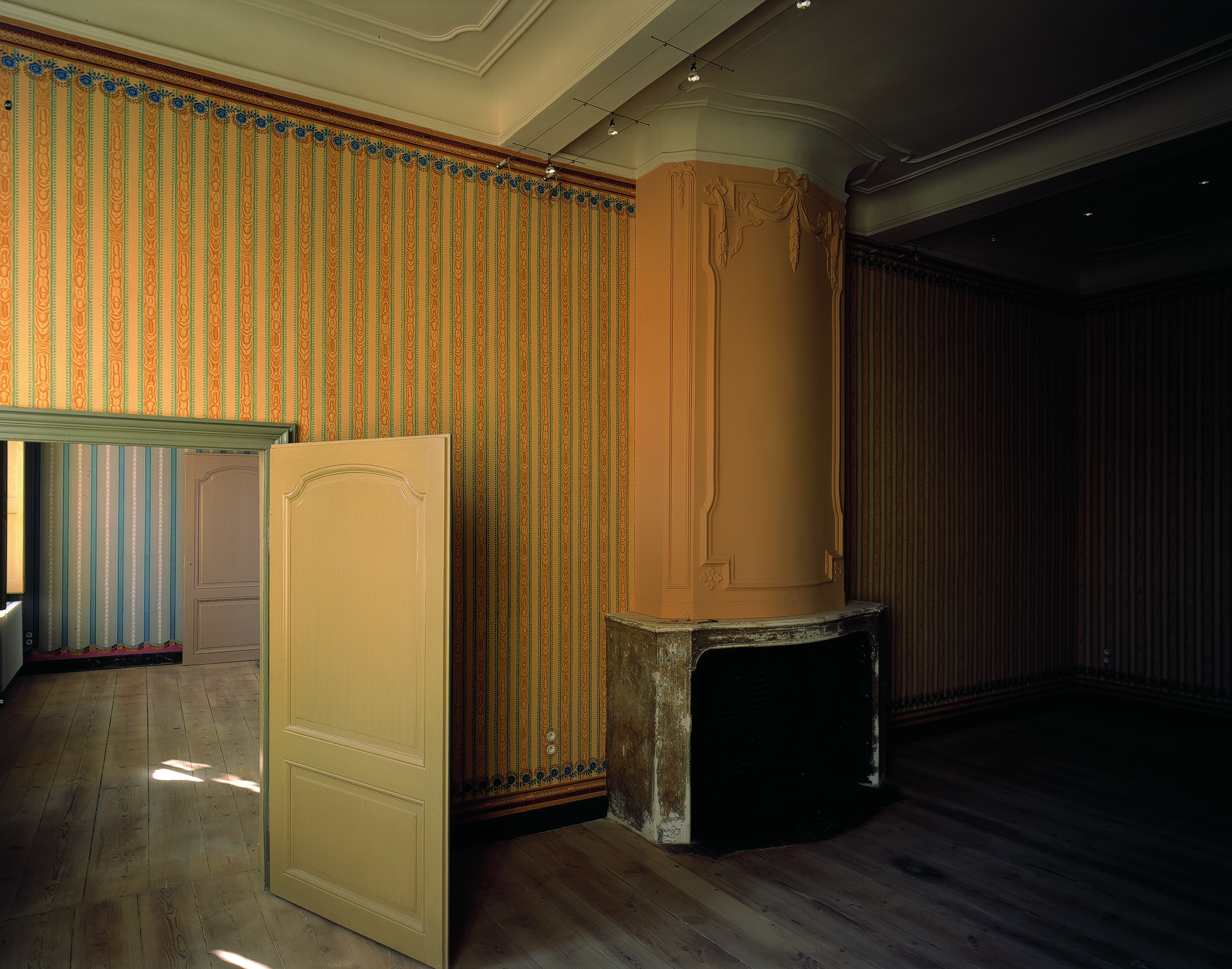 Het hotel d'Haene-Steenhuyse: kamer op de 2de verd. Met reconstructie van de oorspronkelijke beschildering en het moiré behang en boordsel