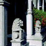 Leeuwenbeelden; ingangsportaal van conciërgerie van een landhuis Publicatie(s): De Westhoek Label(s): villa's / landhuizen / cottages, beeldhouwwerken
