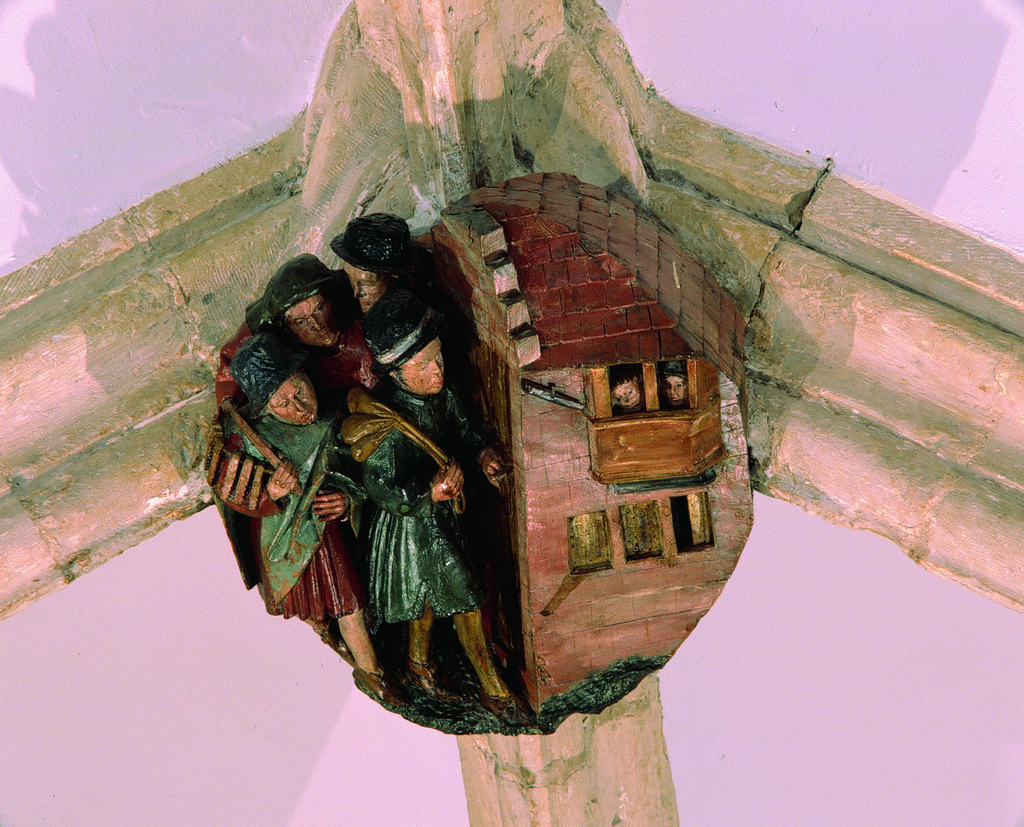Stadhuis van Leuven: gepolychromeerde gewelfsleutel: accijnspachters halen het geld op bij de schuldenaars