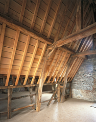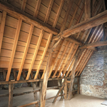 Het vakwerkpand ''Dommershausen'': interieur van de zolderverdieping met dakkap tijdens de restauratie Label(s): woningen, interieurs
