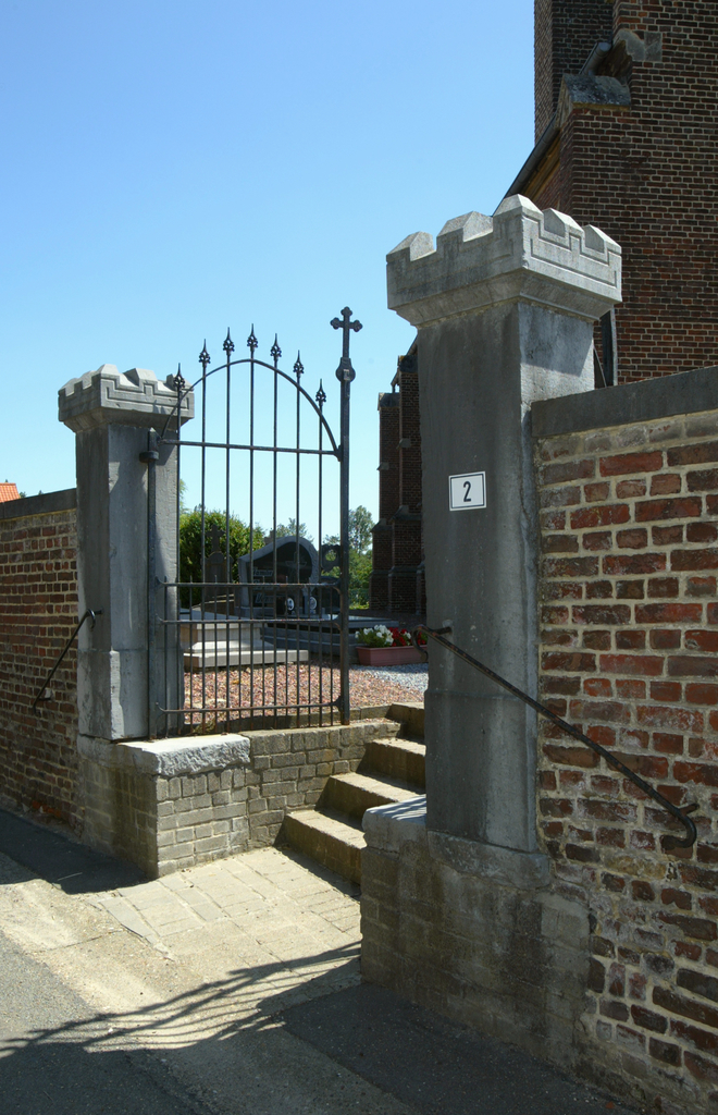 De afbeelding 'De 19de- eeuwse ingangspijlers met kerkhofhek en de vernieuwde trappen' gemaakt door Vandevorst, Kris wordt ter beschikking gesteld door Agentschap Onroerend Erfgoed (AOE) onder de volgende voorwaarden: Modellicentie voor gratis hergebruik, Naamsvermelding 4.0 Internationaal.