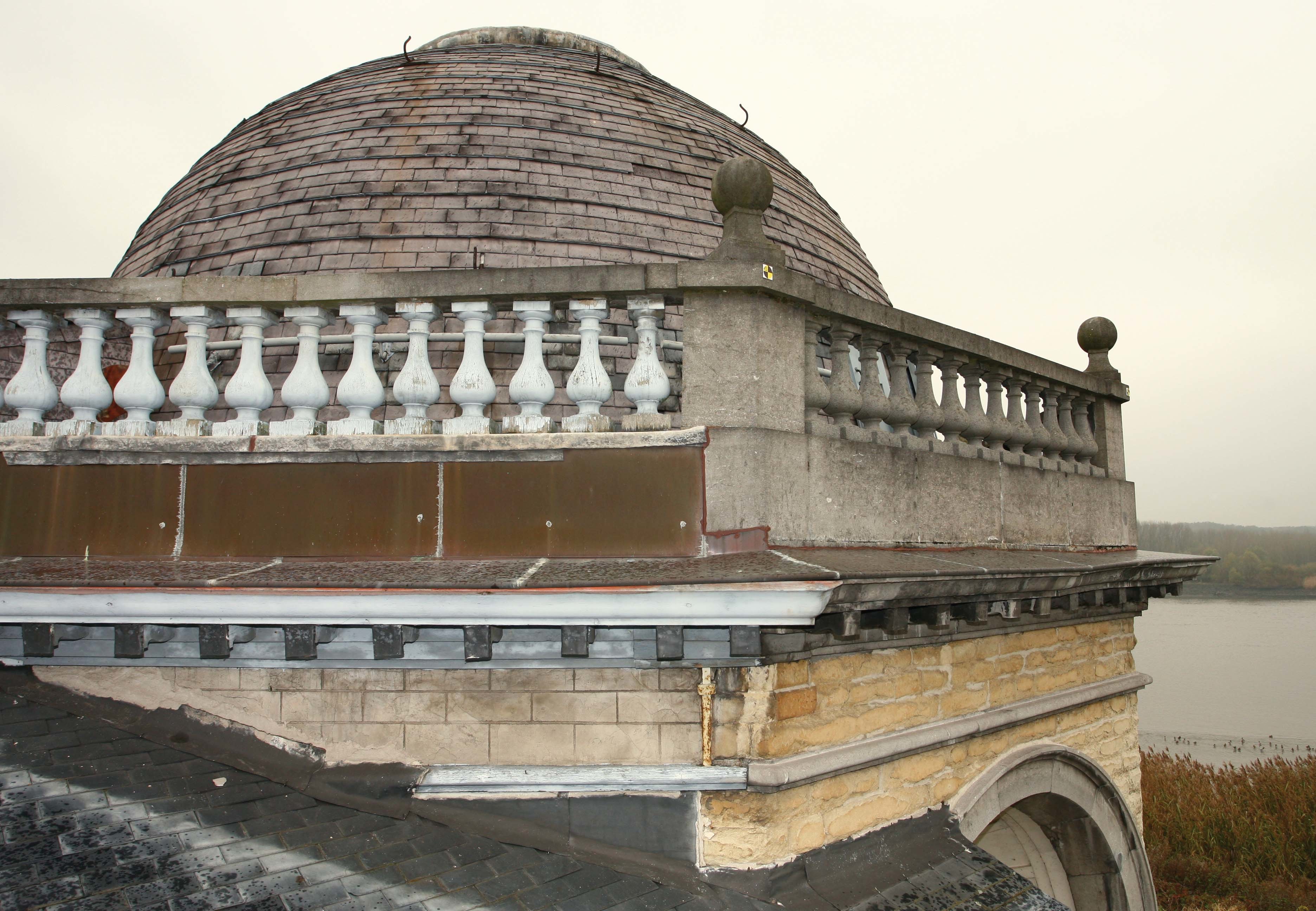 Alle rechten op de afbeelding 'De Notelaer: De balustrade met houten balusters aan de achterzijde van de bovenste galerij. De balk waarop ze staan is deels met koper en deels met lood bekleed.' gemaakt door Vandevorst, Kris zijn voorbehouden aan Vandevorst, Kris.