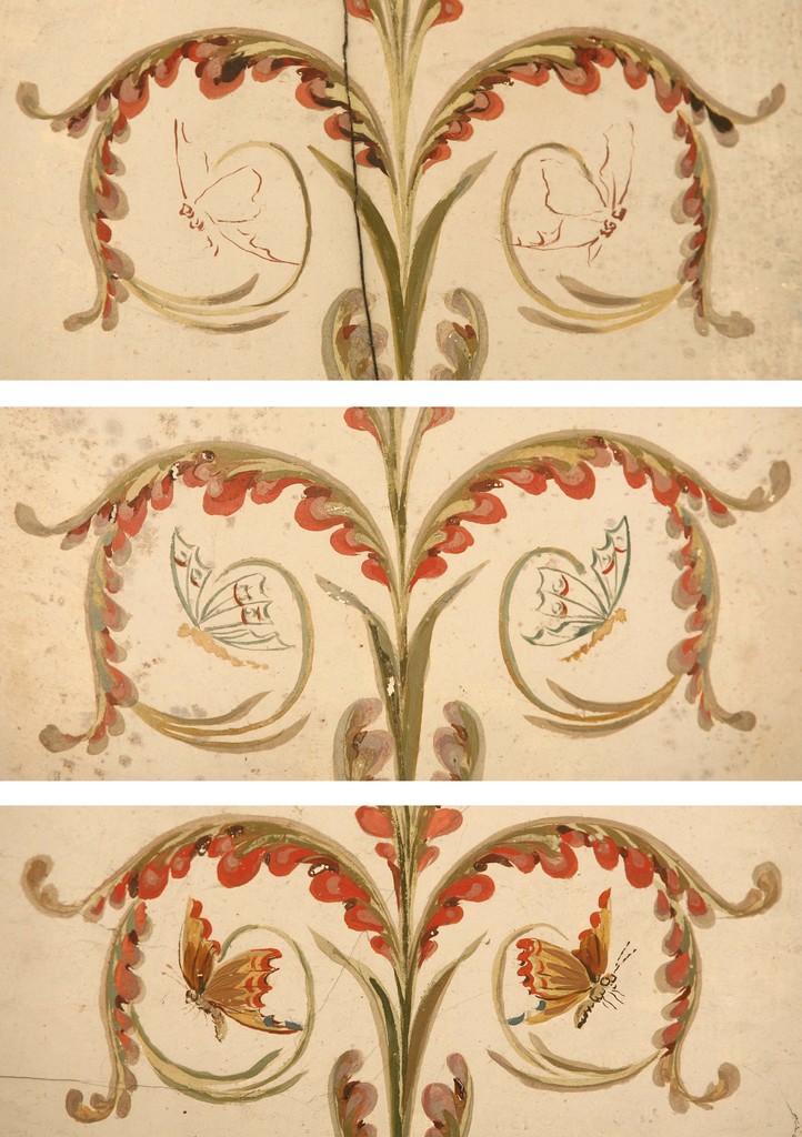 Alle rechten op de afbeelding 'De Notelaer: detail van de koepel ; met bovenaan de minst afgewerkte en onderaan de meest afgewerkte vlinders.' gemaakt door Vandevorst, Kris zijn voorbehouden aan Vandevorst, Kris.