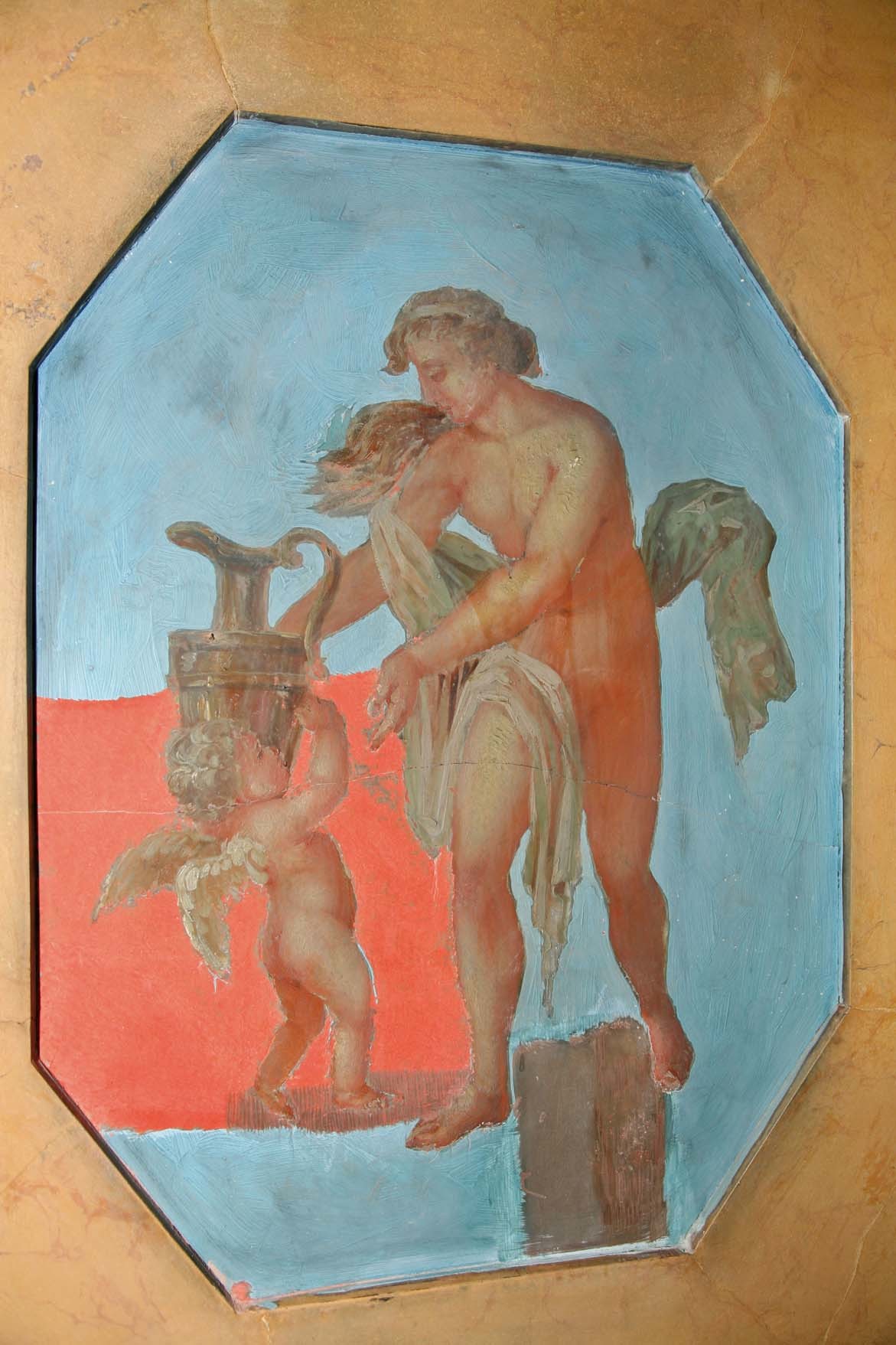 Alle rechten op de afbeelding 'De Notelaer: achthoekig paneeltje met Venus en Amor. Na verwijdering van een deel van de overschilderde achtergrond wordt de originele rode kleur van het stucmarmer zichtbaar.' gemaakt door Vandevorst, Kris zijn voorbehouden aan Vandevorst, Kris.