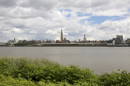 De afbeelding 'De skyline van Antwerpen ; gezien vanaf Linkeroever' gemaakt door Vandevorst, Kris wordt ter beschikking gesteld door Agentschap Onroerend Erfgoed (AOE) onder de volgende voorwaarden: Modellicentie voor gratis hergebruik, Naamsvermelding 4.0 Internationaal.