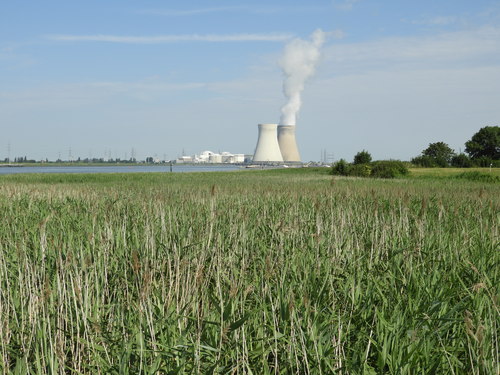 Brakwaterschor langs de Schelde. De koeltorens van de kerncentrale van Doel zijn zichtbaar op de achtergrond.