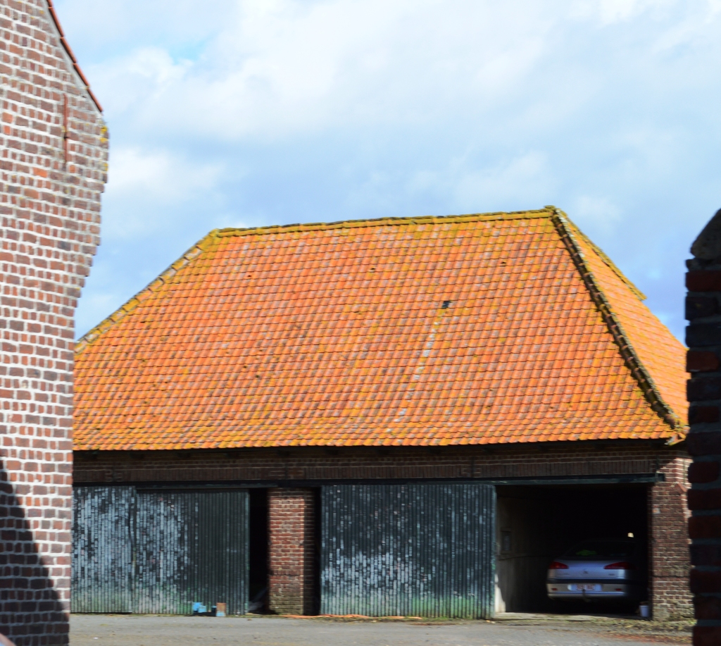 De afbeelding 'Wederopbouwhoeve met monumentaal wagenhuis' gemaakt door Becuwe, Frank wordt ter beschikking gesteld door Agentschap Onroerend Erfgoed (AOE) onder de volgende voorwaarden: Modellicentie voor gratis hergebruik, Naamsvermelding 4.0 Internationaal.