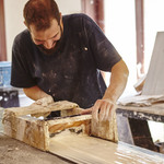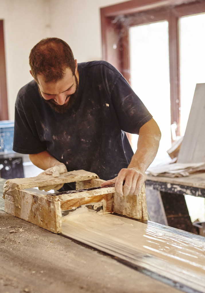 Ambachtelijke fabricage van nieuwe gipsen lijsten.