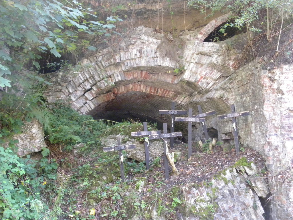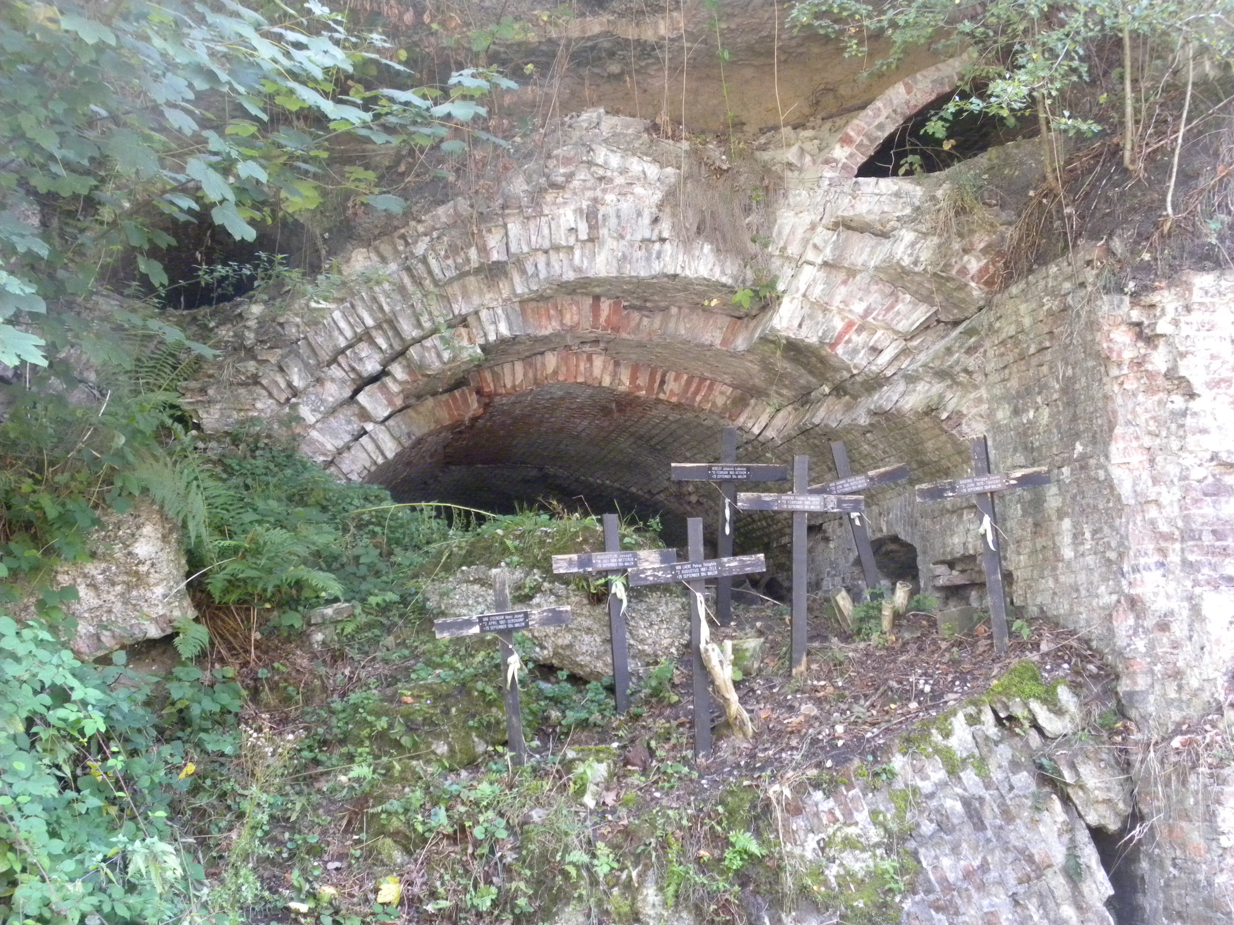 Zichtbare oorlogsschade aan het hoofdfrontgebouw van het fort van Walem van tijdens de Eerste Wereldoorlog. De houten kruisjes herinneren aan de slachtoffers van de beschieting van 28 september tot 2 oktober 1914. Hun lichamen werden nooit geborgen. Het fort van Walem is daarom erkend door het War Heritage Institute als een locatie met oorlogsgraven.