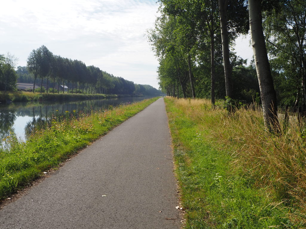 Fietspad langs het kanaal en bomenrijen van populieren.