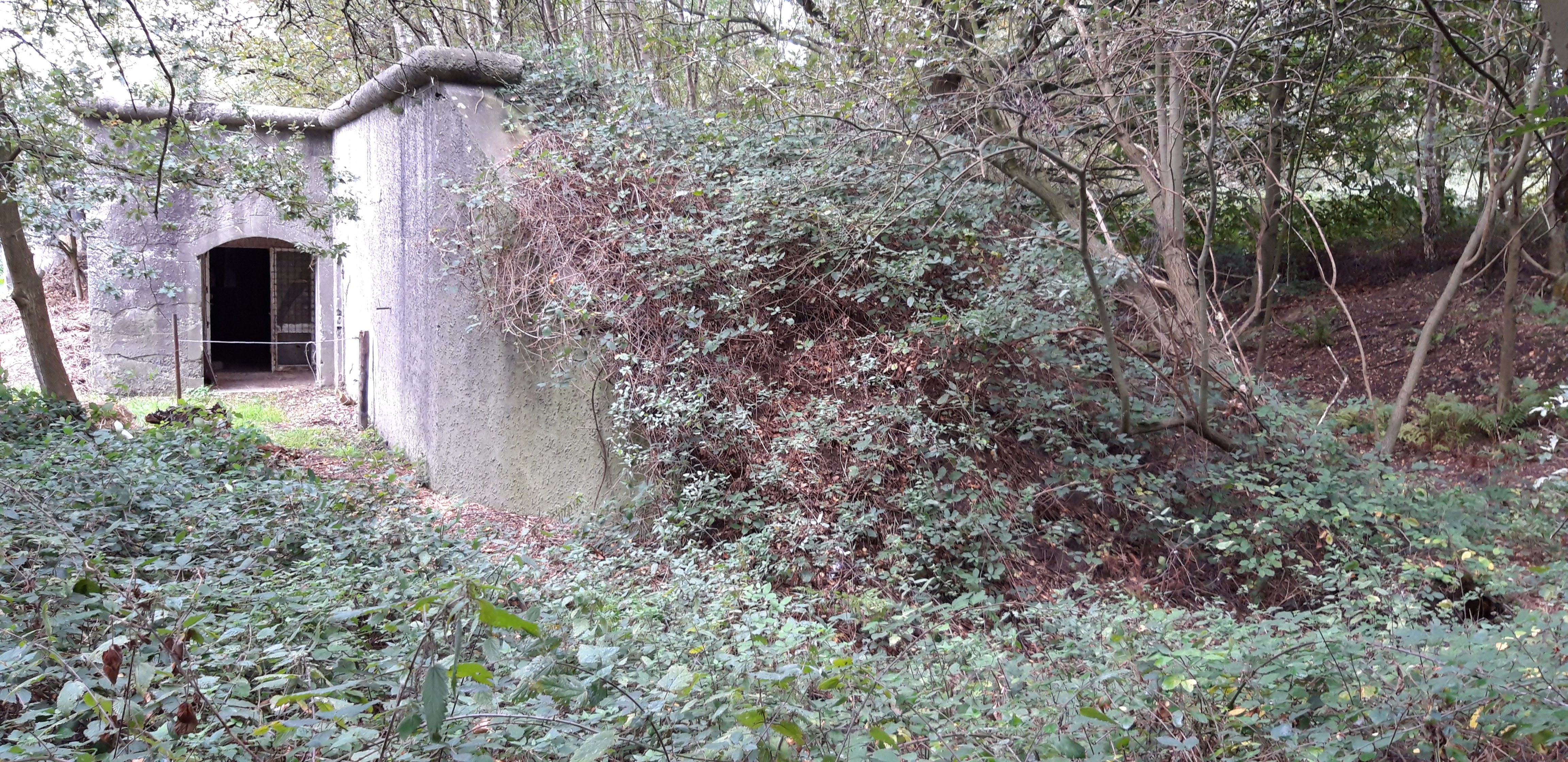 Zicht op de rechterzijkant van het schansgebouw met oreillon. Aan de vijandelijke zijde wordt het schansgebouw beschermd door een aarden dek dat nu helemaal begroeid is. Daarachter ligt een doorgang voor de bemanning naar de geschutkoepel. Via de deuropening op de foto verlieten de manschappen het schansgebouw om hun posities in de geschutkoepel in te nemen.