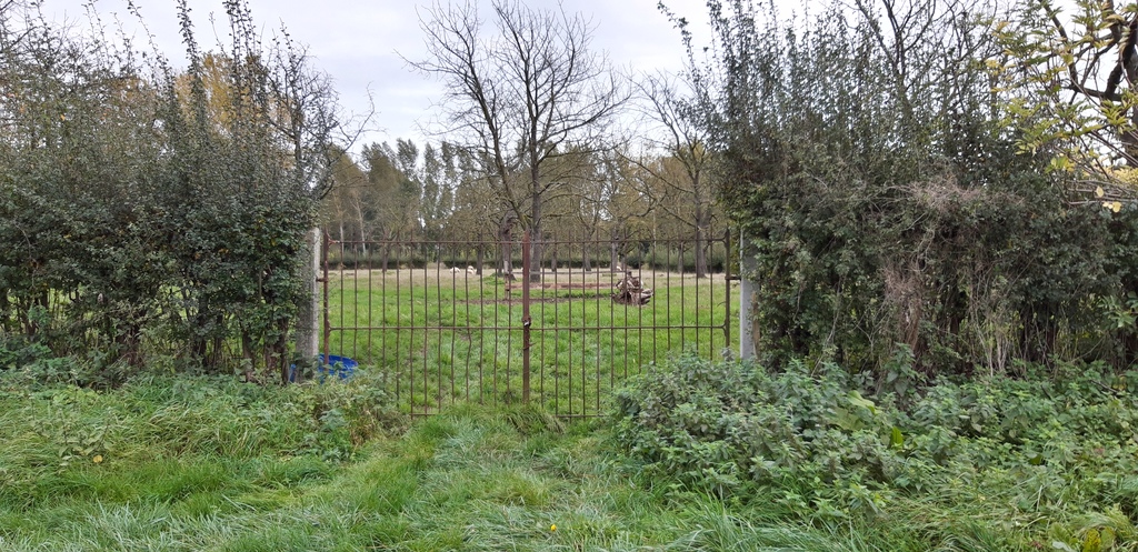 Zicht op één van de omliggende hoogstamboomgaarden met meidoornhaag en hek langs de Passtraat.