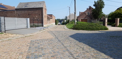 Kruispunt van de Konijnenbergstraat en de Druivenweg: links overweegt de ros gekleurde Tiense kwartsiet, rechts de grijze variant.