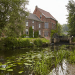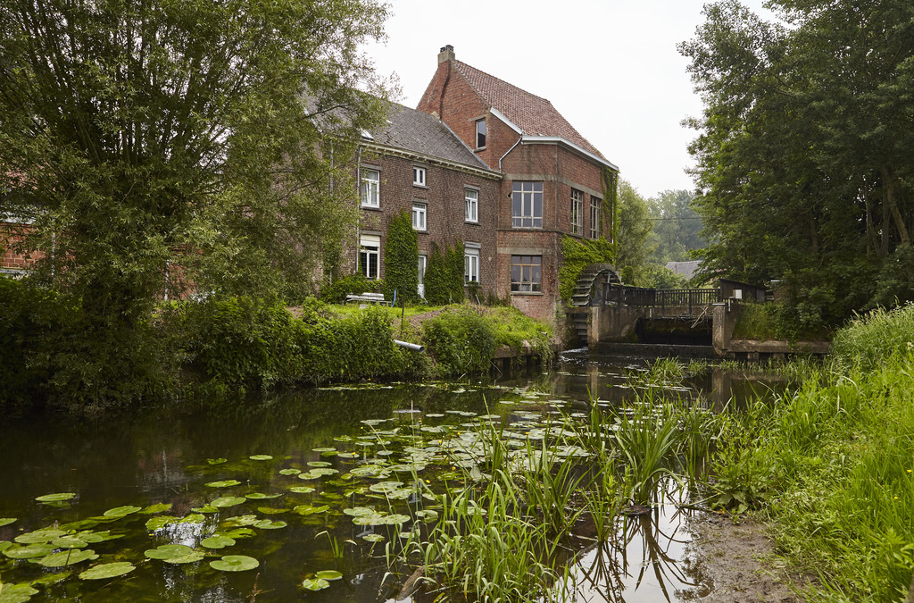 Watermolen op een oude hoevesite met ringgracht. Foto genomen voor de uitreiking van de Onroerenderfgoedprijs 2018. Heetveldemolen in Tollembeek is de winnaar van de Prijs participatie.