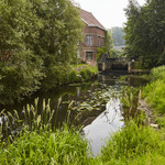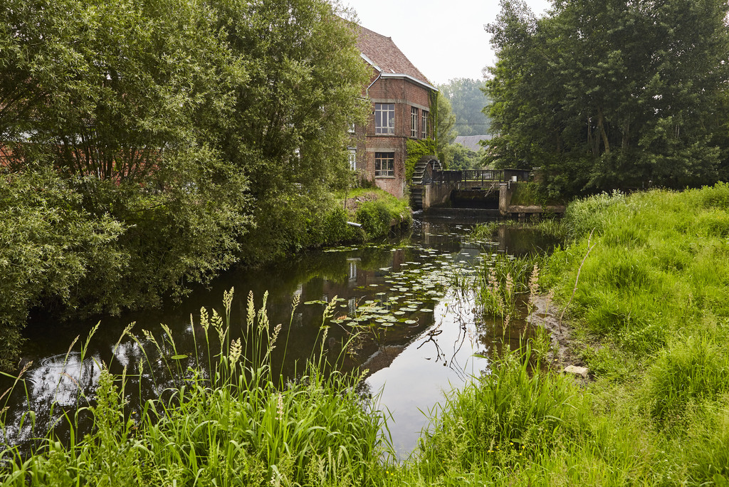 Watermolen op een oude hoevesite met ringgracht. Foto genomen voor de uitreiking van de Onroerenderfgoedprijs 2018. Heetveldemolen in Tollembeek is de winnaar van de Prijs participatie.