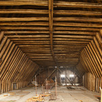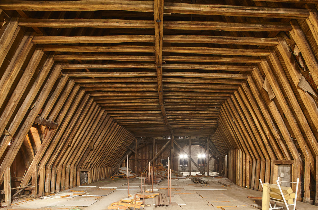Dakkap van de zuidelijke ziekenzaal van het Sint-Janshospitaal. De hanenbalkfliering is opgehangen aan de pennen van de makelaars.
