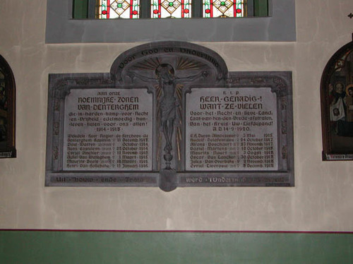 De afbeelding 'Dentergem Kerkstraat zonder nummer Parochiekerk Onze-Lieve-Vrouw en Sint-Stephanus gedenkplaat' gemaakt door Van Vlaenderen, Patricia wordt ter beschikking gesteld door Agentschap Onroerend Erfgoed (AOE) onder de volgende voorwaarden: Modellicentie voor gratis hergebruik, Naamsvermelding 4.0 Internationaal.
