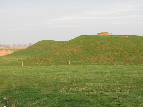 Zicht op de westelijke en noordelijke bastionpunt van het 16de-eeuwse fort van Nieuwendamme. Op de westelijke bastionpunt is de top van een Duitse bunker te zien. In oktober 1914 zette het Belgische leger de hele omgeving onder water. De Duitse troepen bouwden op het hoger gelegen fort van Nieuwendamme 5 bunkers voor de verdediging van hun frontlijn.
