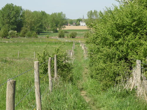 Pad door de vallei van de Velpe, met de Sint-Antoniuskerk van Attenrode in de achtergrond