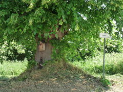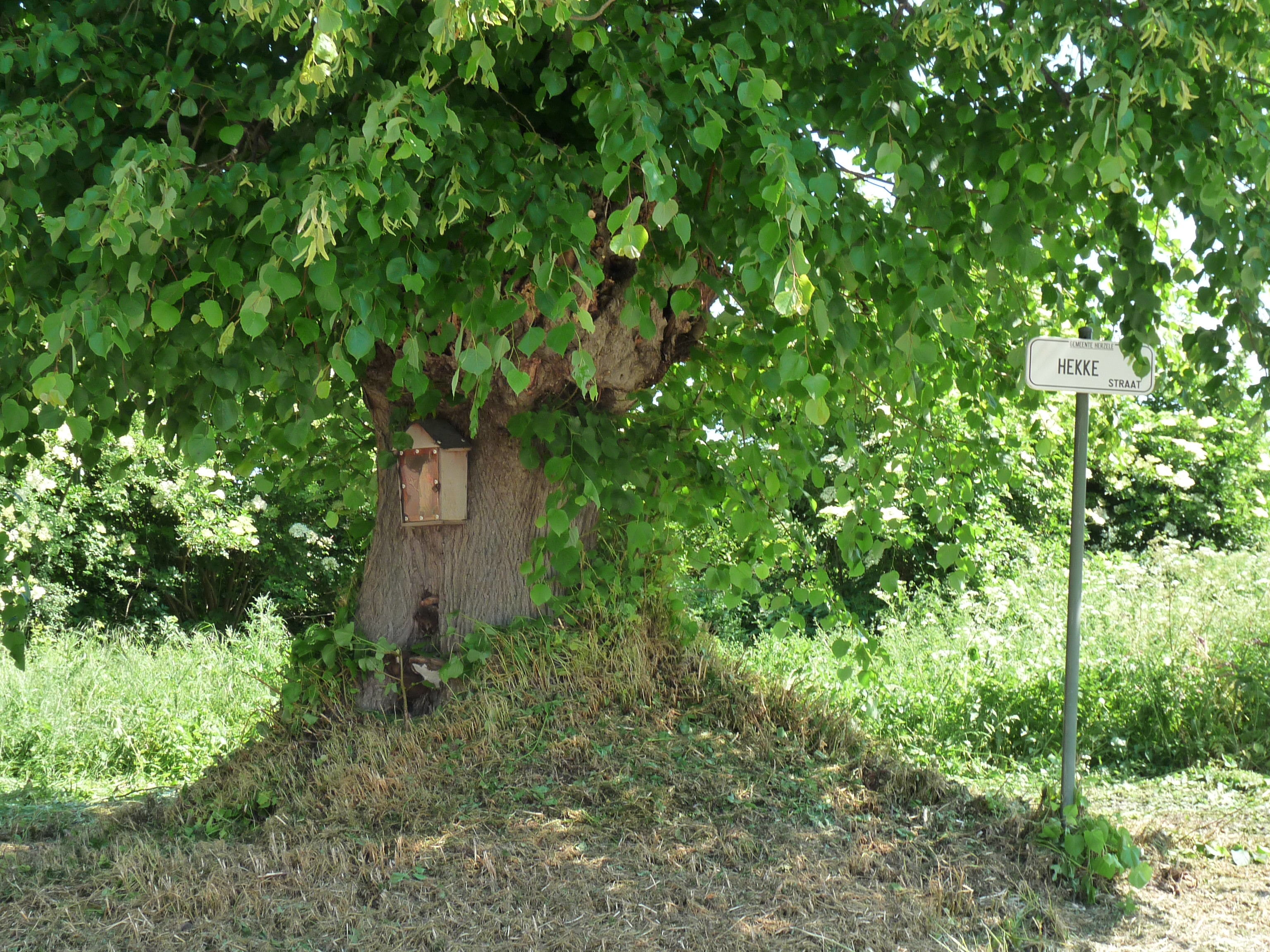 De afbeelding 'Opgaande linde met boomkapel bij kruispunt' gemaakt door Schepens, Annelies wordt ter beschikking gesteld door Agentschap Onroerend Erfgoed (AOE) onder de volgende voorwaarden: Modellicentie voor gratis hergebruik, Naamsvermelding 4.0 Internationaal.