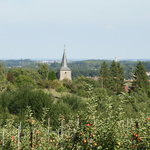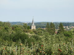 Zicht op de Sint-Servatiuskerk in het heuvelende Haspengouw. De kerk, te midden van het omringend, ommuurd kerkhof, ligt op een heuvel en vormt zo een baken in het landschap.