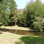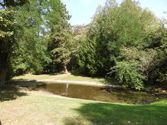 Vijver in het park bij kasteel Heuvelhof in Kessel-Lo. Park met solitaire bomen, aangelegd in Engelse landschapsstijl. Kenmerkend voor deze stijl zijn de openheid, de smalle en naar verschillende kanten uitlopende vijver, de slingerende padenstructuur al dan niet omzoomd door bomenrijen (onder andere sparren en beuken), bijzondere bomengroepen (kastanje- en beukengroepen) en enkele waardevolle solitaire bomen (treurbeuk (Fagus sulvatica ‘Pendula), mammoetboom (Sequoiadendron giganteum), Drents krenteboompje (Amelanchier grandiflora)) en weideachtige grasvlakten.