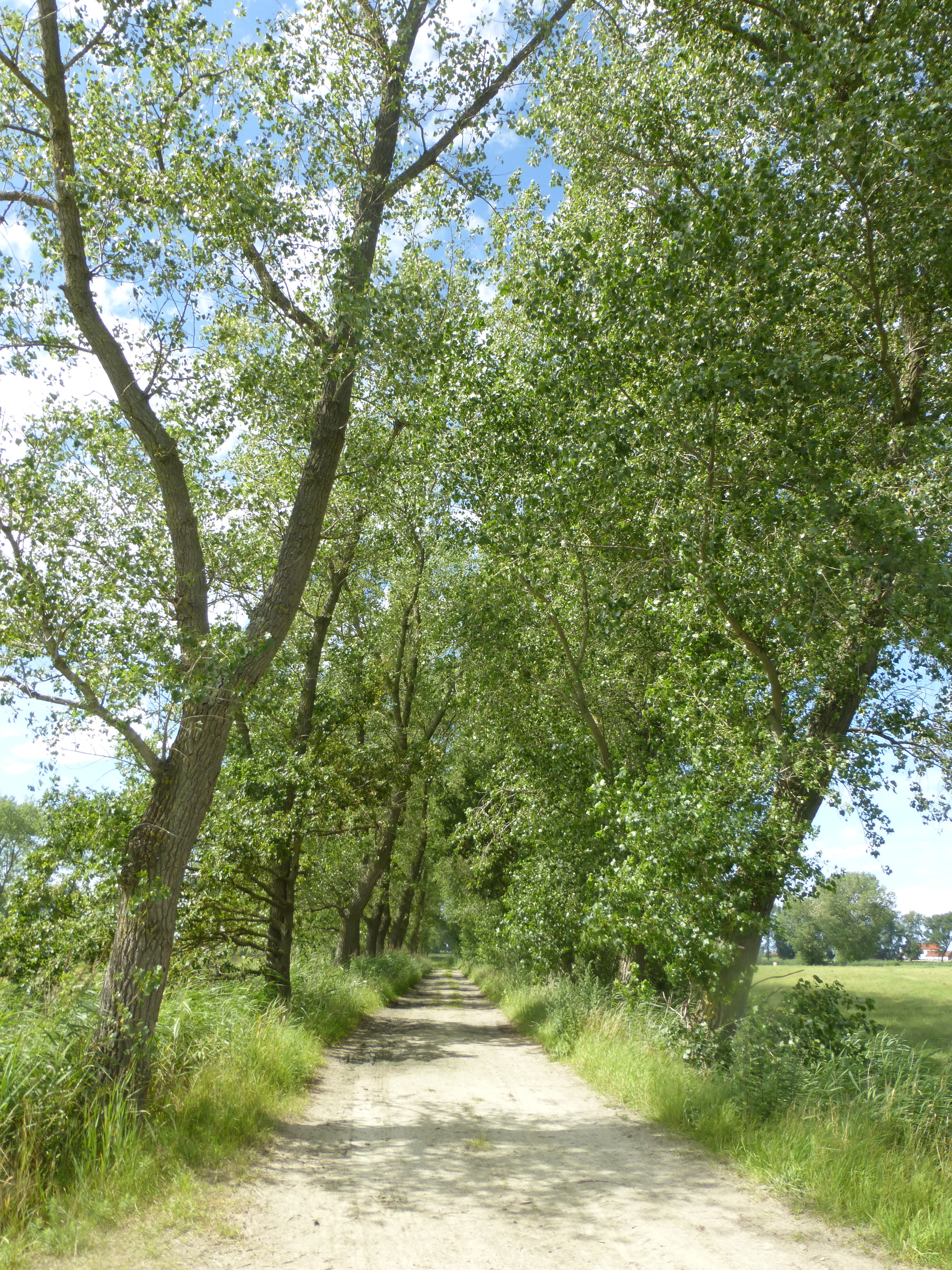 De onverharde Moerstraat met populierenbeplanting.