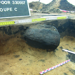 Terreinopname van coupe op Romeins graf met zicht op de grafgift in aardewerk.