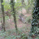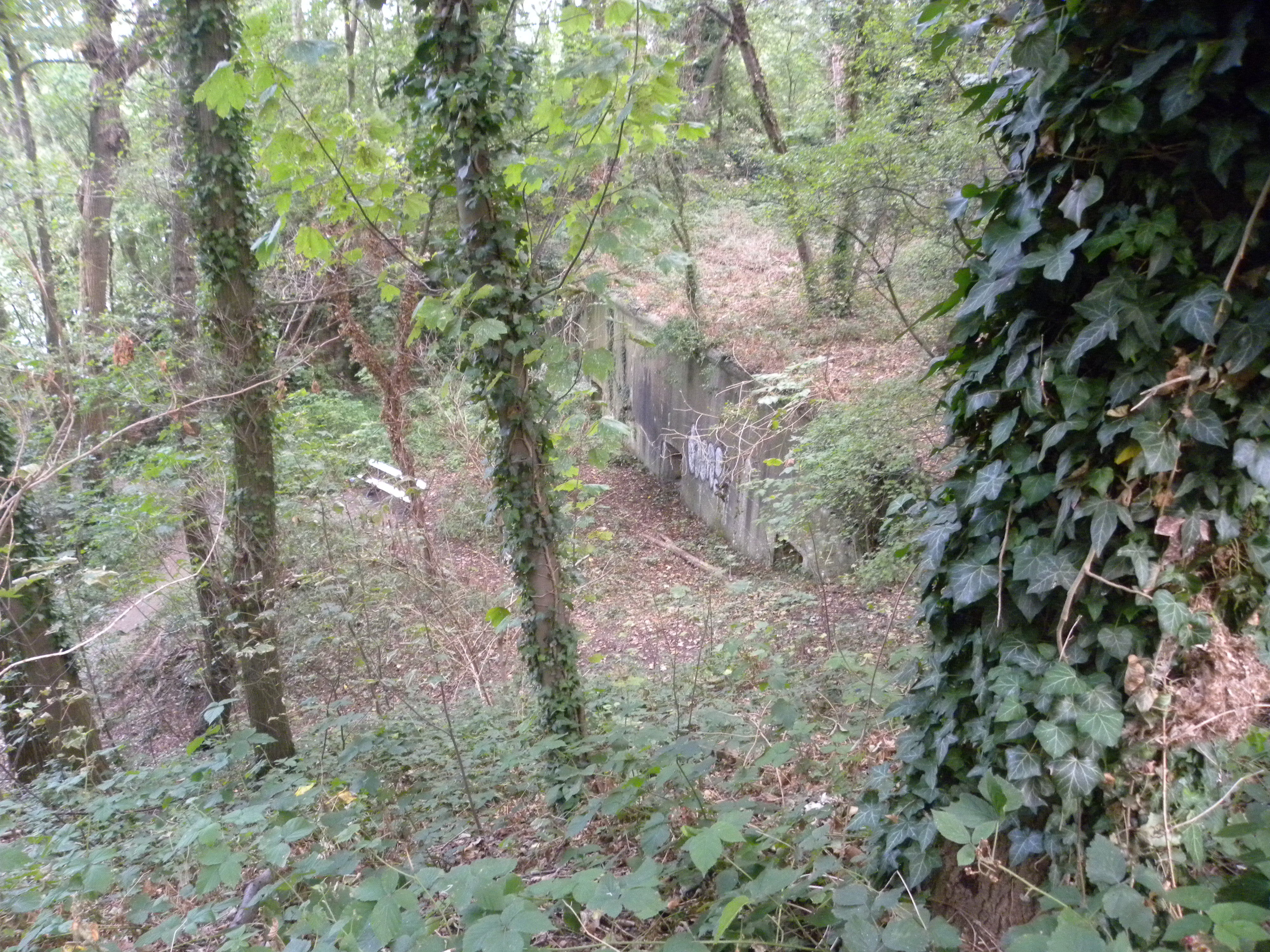 Zicht op de met beton versterkte hoofdcaponnière van boven op de hoge wallen aan de rand van het forteiland. De betonnen versterkingen zijn een uiting van de modernisering van het fort in 1911-1912.